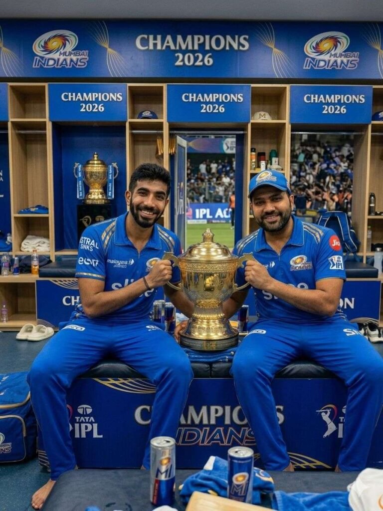 A professional-quality, ultra-realistic 8k photograph of Rohit Sharma (on the right) and Jasprit Bumrah (on the left) sitting side-by-side in a modern Mumbai Indians (MI) dressing room. Both players are wearing the official 2026 Mumbai Indians blue jersey featuring the "Lauritz Knudsen" and "Malaysia Airlines" sponsor logos, paired with matching blue team trousers. They are leaning in closely with bright, excited smiles, proudly holding the golden IPL trophy between them. In the background, the metallic lockers are adorned with "CHAMPIONS 2026" branding and MI logos. The lighting is cinematic and high-contrast, highlighting the glossy gold of the trophy and the detailed fabric texture of the jerseys. Shot on DSLR, sharp focus, photorealistic, depth of field, HDR.