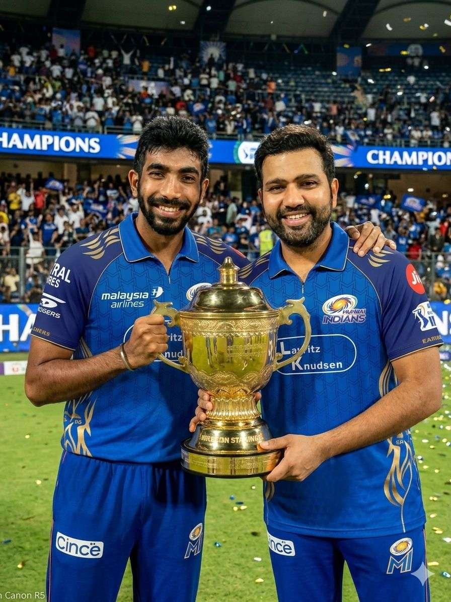 A professional-quality, ultra-realistic photograph of two cricketers, Rohit Sharma (on the right) and an Indian player (on the left based on the user-uploaded photo). Both are wearing the exact Mumbai Indians (MI) blue jersey with sponsor logos like “Lauritz Knudsen” and “Malaysia Airlines,” along with matching blue trousers (provided by the user (reference image), just like an official MI kit. They are standing confidently side-by-side in a modern cricket dressing room, with metallic lockers in the background. Both players are holding and proudly presenting the golden Indian Premier League (IPL) trophy placed between them. Rohit Sharma has a well-groomed beard, short styled hair, and a calm yet confident expression, looking directly into the camera. The young player has slightly windswept hair and a bright, excited smile, reflecting youthful energy and ambition. The lighting is cinematic and high-contrast, highlighting the glossy texture of the trophy, the fabric details of the MI jersey, and realistic skin tones. The background subtly features Mumbai Indians branding and large stylized text, adding authenticity. ultra realistic, 8k, DSLR, cinematic lighting, sharp focus, photorealistic, detailed fabric texture, depth of field, HDR.